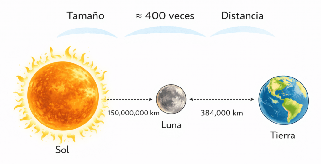 Aunque el Sol es muchísimo más grande que la Luna, también está muchísimo más lejos de nosotros. Y lo sorprendente es que la proporción entre tamaño y distancia es casi la misma. El Sol se encuentra a unos 150 millones de kilómetros de la Tierra, mientras que la Luna está a una distancia media de unos 384.000 kilómetros.