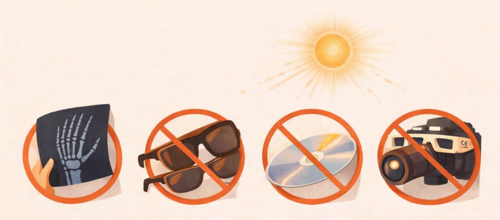 Radiografías, cristal ahumado, CDs, dos gafas de sol superpuestas… Todo eso no bloquea la radiación peligrosa como debe. Tampoco un filtro ND fotográfico “cualquiera”. Y cuidado con esta trampa: mirar por prismáticos, cámara o telescopio llevando puestas gafas para eclipse. No vale. Esas ópticas concentran la luz: necesitan su filtro solar frontal específico.