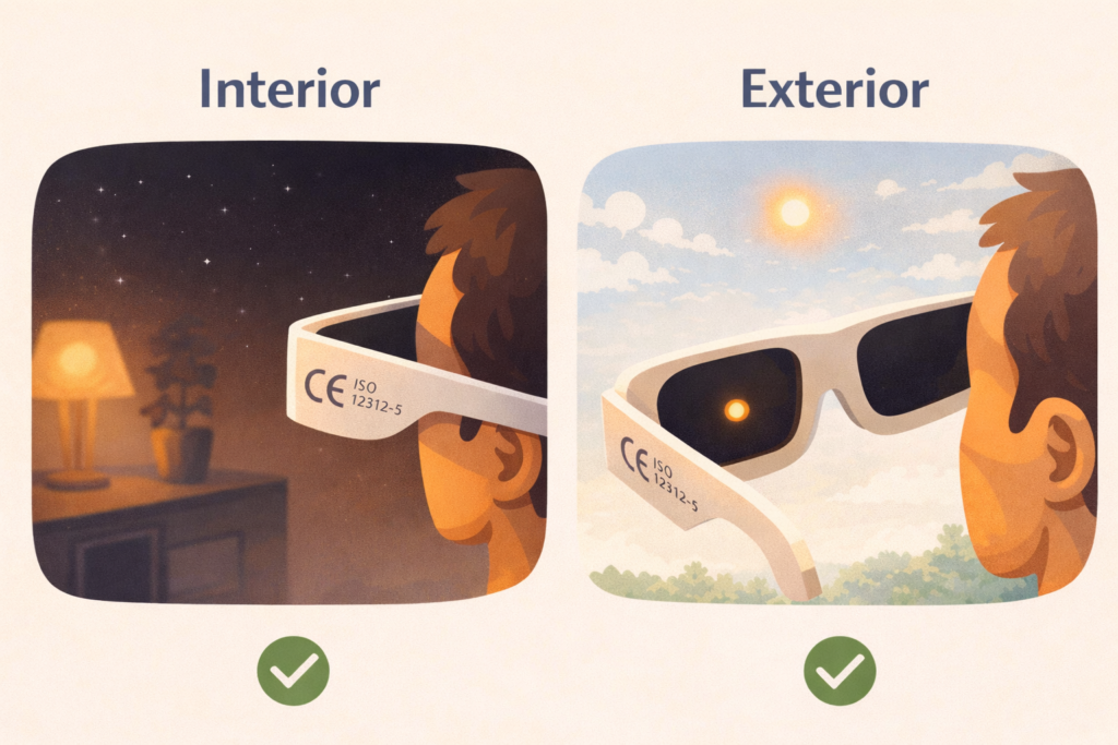 La primera vez que te pones unas gafas para eclipse puede decepcionar: todo se ve casi negro. Y piensas: “¿Esto es normal?”. Sí. Justo por eso son seguras. Un buen filtro solar para observación directa del Sol bloquea tanta luz que, en interiores, no verás prácticamente nada. En exterior, el Sol se convierte en un disco muy tenue y nítido. Si tus gafas no hacen eso, no valen.